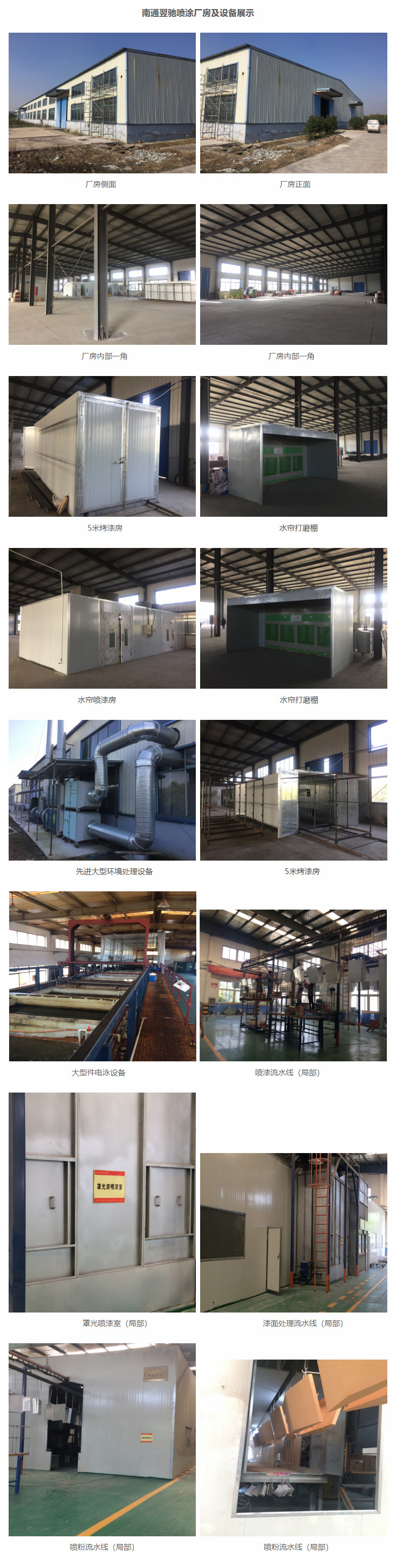 南通翌馳工業(yè)配件有限公司占地面積5000余平方米,建筑面積3000余平方米,擁有現(xiàn)代化環(huán)保型涂裝生產(chǎn)線三條,均采用國(guó)內(nèi)先進(jìn)的設(shè)計(jì)和建造理念,集科學(xué)、自動(dòng)、高效、節(jié)能、環(huán)保為一體,在進(jìn)一步提高核心競(jìng)爭(zhēng)力的同時(shí),降低了污染排放,強(qiáng)化了社會(huì)責(zé)任感。公司目前擁有大型自動(dòng)化靜電粉末噴涂流水線一條,大型環(huán)保型噴漆流水線兩條。同時(shí)配套有無(wú)塵打磨房、水幕噴漆房、無(wú)塵噴漆房、高低溫烤漆房、環(huán)保型噴砂房、脫脂磷化槽、污水處理設(shè)備等現(xiàn)代化設(shè)備??杉庸らL(zhǎng)度20米,單件重量可達(dá)十噸以上,日噴涂量1000㎡以上。